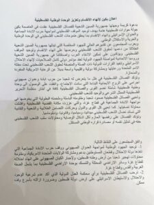 Berbicara kepada Al Jazeera Net dari Tiongkok, Abu Youssef menggambarkan apa yang dinyatakan dalam pernyataan tentang mengakhiri perpecahan sebagai “masalah penting yang harus dibangun dalam beberapa hari mendatang dengan partisipasi semua orang dalam kerangka nasional tunggal, untuk menghadapi apa yang akan dilakukan pendudukan pada masa mendatang atau kembalinya ‘Israel’ melakukan pendudukan.”