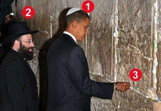 Sementara itu, di sisi sebelah kiri, nampak Barack Husein Obama, mengenakan topi khas Yahudi, skulakap dan ditemani beberapa Rabi Yahudi, juga sedang berdoa khusyuk di tembok ratapan, Israel. Teks dibawahnya tertulis, juga dengan bahasa Arab, Barack Husein Obama.