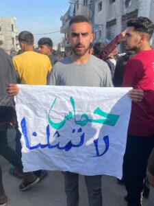 Pada hari Rabu, beberapa orang membawa poster bertuliskan “Hamas tidak mewakili saya.”
