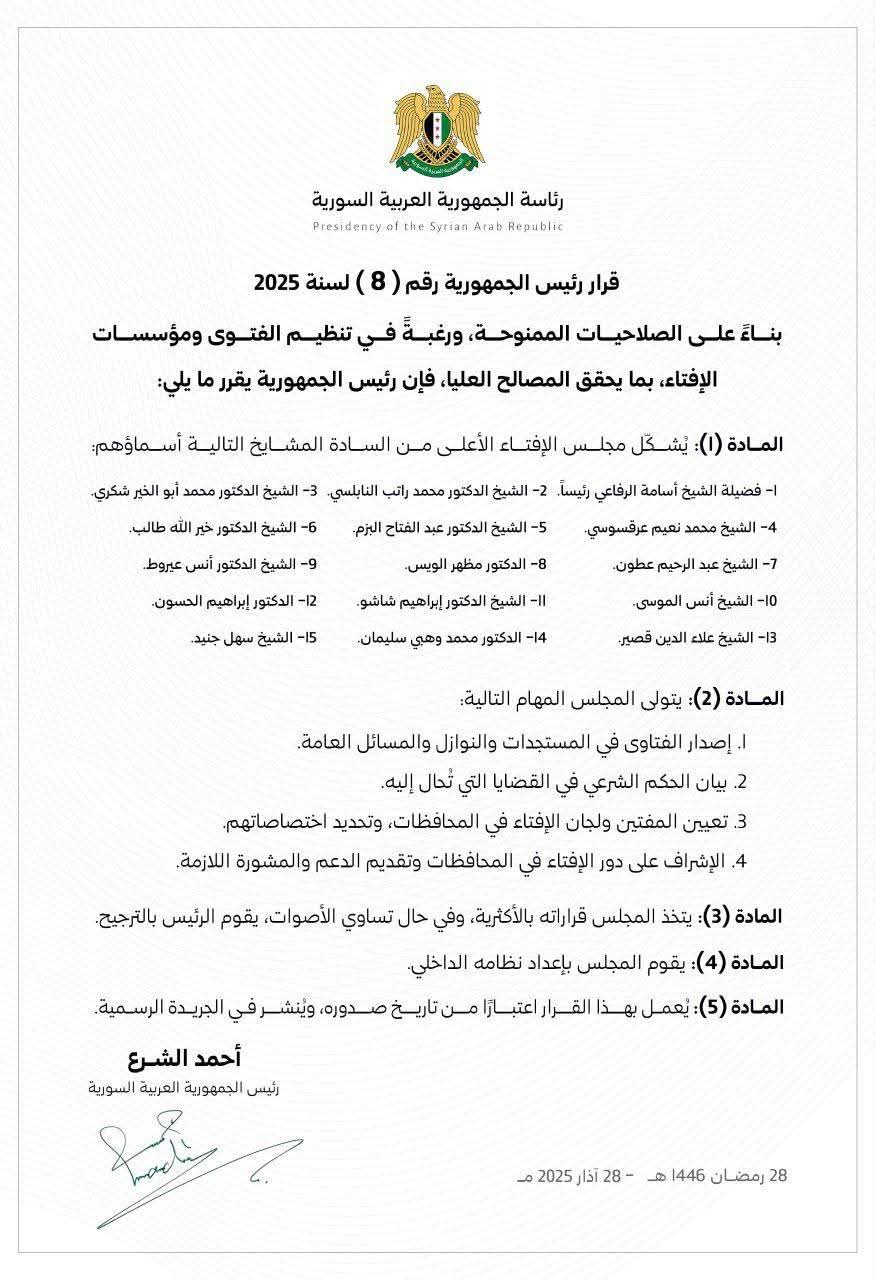 Tak hanya itu, pemerintah juga membentuk Dewan Fatwa Tertinggi, yang beranggotakan para ulama terkemuka dari berbagai latar belakang keislaman di Suriah. Keputusan ini tertuang dalam Keputusan Presiden Nomor (8) Tahun 2025. Dewan Fatwa ini berperan sebagai lembaga rujukan dalam pengambilan keputusan keagamaan dan kebijakan yang menyangkut umat Islam di Suriah.