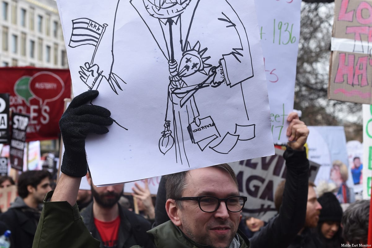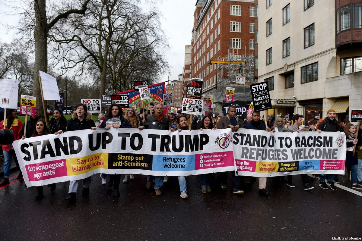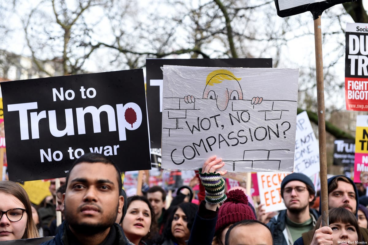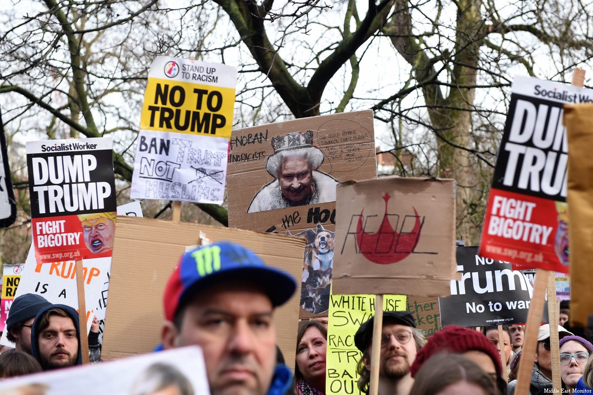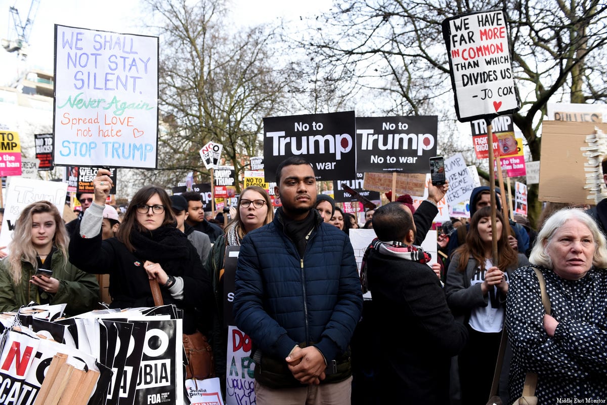 Sekitar 10.000 orang berjalan dari kedutaan ke Jalan Downing 10 di mana kantor-kantor pemerintah Inggris juga memprotes Perdana Menteri Theresa Mei yang sejauh ini gagal untuk mengutuk pembatasan terbaru oleh pemerintah AS.