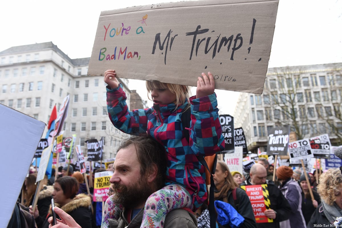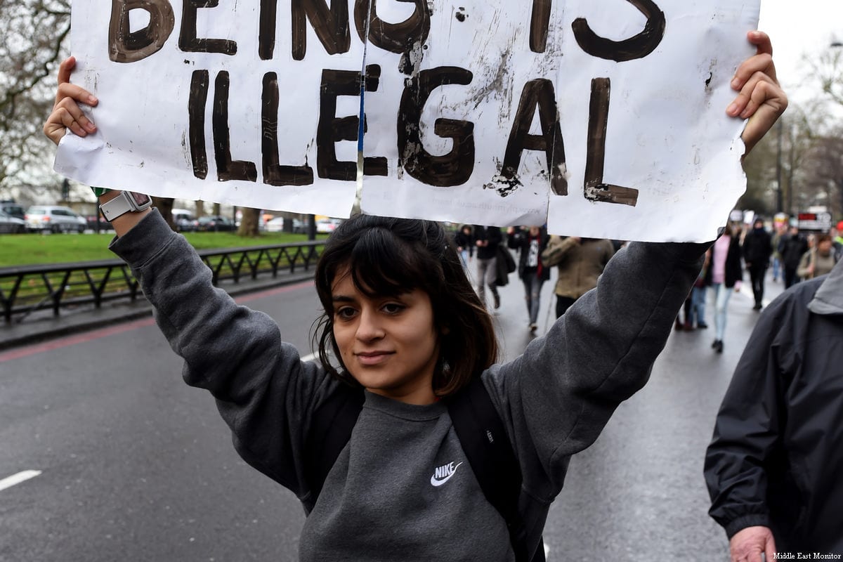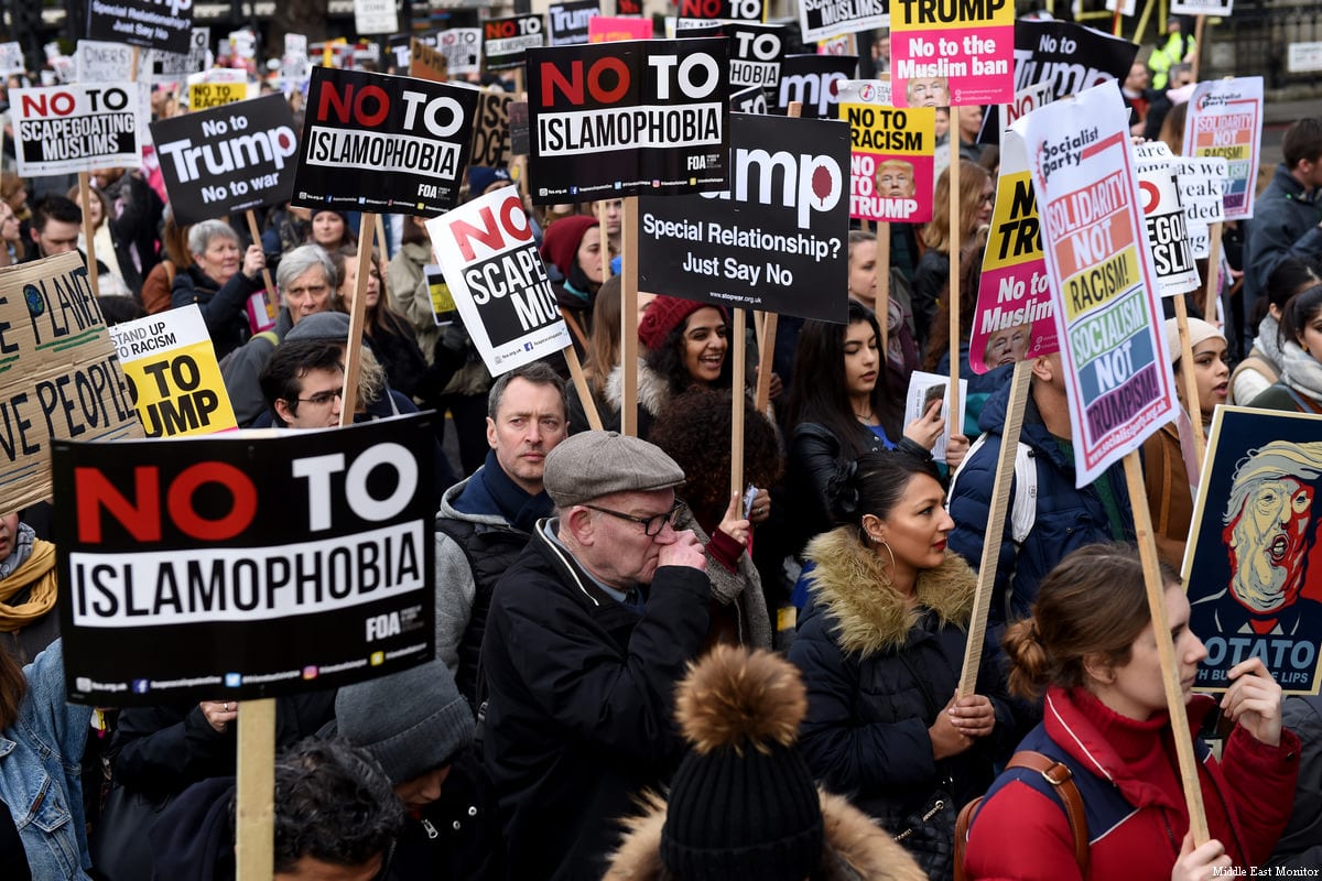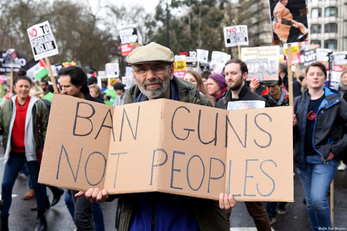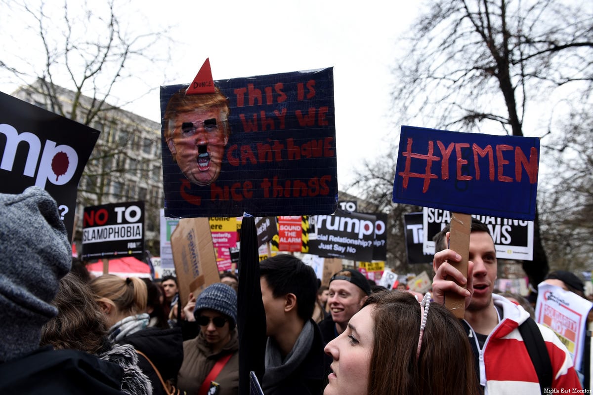 Sekitar 10.000 orang berjalan dari kedutaan ke Jalan Downing 10 di mana kantor-kantor pemerintah Inggris juga memprotes Perdana Menteri Theresa Mei yang sejauh ini gagal untuk mengutuk pembatasan terbaru oleh pemerintah AS.