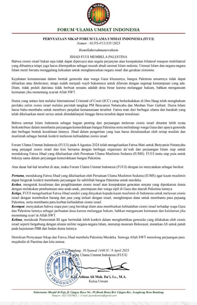 Pernyataan ini menjadi bentuk konkret dukungan FUUI terhadap jihad Palestina, seiring dengan eskalasi kekerasan dan genosida yang terus dilakukan oleh entitas zionis terhadap rakyat sipil di Gaza dan wilayah lainnya.