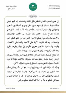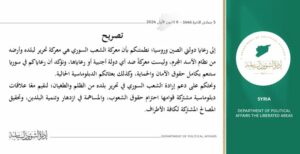“Kami meyakinkan Anda bahwa perjuangan rakyat Suriah adalah pertempuran untuk pembebasan negara dan tanah mereka dari rezim kriminal Assad dan bukan pertempuran melawan negara asing atau warga negaranya. Kami mengonfirmasi bahwa warga negara Anda di Suriah akan menikmati hak penuh atas keselamatan dan perlindungan, seperti halnya misi diplomatik Anda saat ini,” kata pernyataan itu.