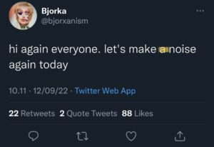 Selanjutnya, di akun twitter barunya, Bjorka menulis 'make a noise'. Dea mengatakan bahwa mayoritas penutur Indonesia terbiasa mengasosiasikan suara dengan “a”(bisa dihitung). Padahal di dalam bahasa Inggris, ‘noise’ itu termasuk uncountable noun, sehingga lebih natural jika menggunakan ‘some’, bukan ‘a’.