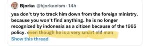 “Melihat lexicon (collections of words) yg dipakai Bjorka, saya cukup yakin bahwa dia adalah orang Indonesia. Penggunaaan double conjunction “because since” setelah tanda titik ini adalah tipikal khas orang Indonesia untuk menulis B. Inggris dengan style ‘indoglish’.” cuit Dea.