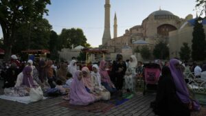 Sejumlah muslimah melaksanakan shalat Idul Adha di dekat masjid ikonik Hagia Sophia, 28 Juni 2023.