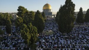 Umat Muslim melaksanakan shalat Idul Adha di sebelah kuil Dome of the Rock di Masjid Al-Aqsa di Kota Tua Yerusalem, 28 Juni 2023. (hanoum/arrahmah.id)