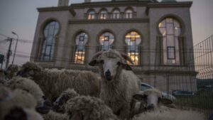 Seekor domba dijual di depan sebuah masjid di dekat ibu kota Kosovo, Pristina.