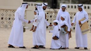 Umat Muslim Emirat bertukar harapan setelah shalat subuh Idul Adha di masjid utama Dubai, 28 Juni 2023.