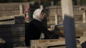 Seorang muslimah Irak mengunjungi makam seorang kerabat, 28 Juni 2023.