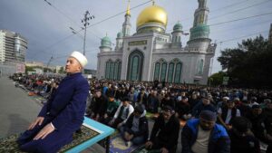 Umat Muslim shalat Ied di luar Masjid Katedral Moskwa pada 28 Juni 2023.