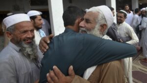 Para pengungsi Afghanistan berbagi salam Idul Adha setelah menghadiri shalat di sebuah masjid di kamp pengungsi Kazana di pinggiran kota Peshawar, Pakistan, 28 Juni 2023.
