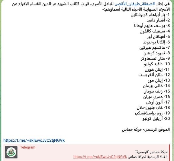 “Sebagai bagian dari kesepakatan Thufan Al-Aqsha untuk pertukaran tahanan, kami memutuskan untuk membebaskan 20 tahanan ‘Israel’ yang masih hidup,” ungkap pernyataan resmi Hamas.