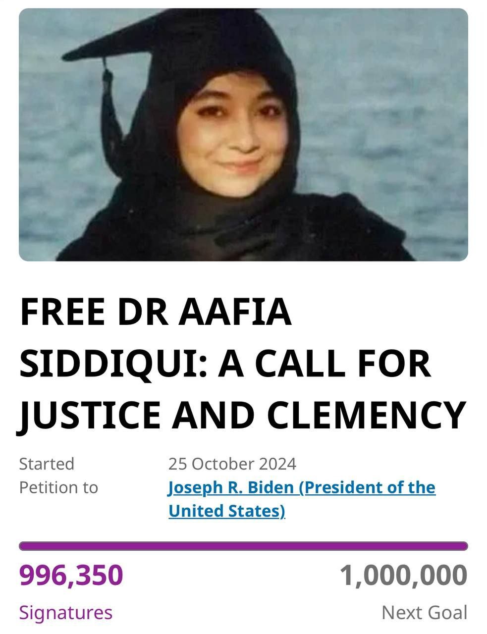 TEXAS (Arrahmah.id) - Petisi untuk membebaskan Dr. Aafia Siddiqui, seorang pakar neurosains asal Pakistan yang kini dipenjara di Amerika Serikat, telah mencapai hampir 1 juta tandatangan. Petisi ini menyerukan Presiden AS, Joe Biden, untuk memberikan pengampunan kepada Dr. Siddiqui dan mengizinkannya kembali bersama keluarganya setelah bertahun-tahun penahanan yang dianggap tidak adil.