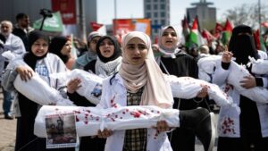 Massa pawai, yang sesekali menerikan takbir, menggendong bayi-bayi mati yang dibungkus kain kafan berdarah untuk menggambarkan kematian di Gaza.
