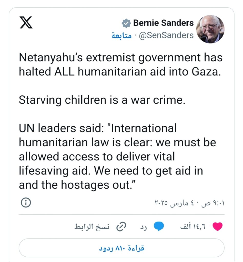Senator yang dikenal vokal menentang kebijakan rasis Washington dan Tel Aviv terhadap Palestina ini sebelumnya juga mengecam rencana Presiden AS Donald Trump untuk merebut Gaza dan secara paksa mengusir warganya.