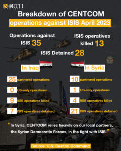 Di timur laut Suriah, CENTCOM bertujuan untuk terus mengembangkan dan memungkinkan Pasukan Demokratik Suriah (SDF) mengalahkan ISIS dan meminta negara-negara internasioanl untuk memulangkan keluarga ISIS yang ada dari kamp Hawl dan Roj.