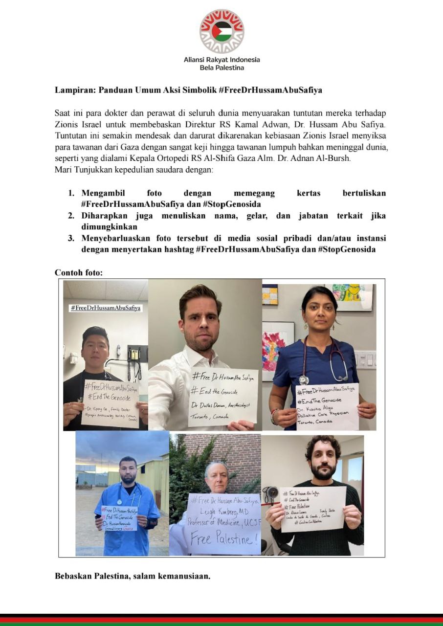 Panduan aksi ini disertai dengan contoh-contoh foto dari tenaga kesehatan dunia yang telah berpartisipasi, menunjukkan dukungan global terhadap pembebasan Dr. Hussam dan penghentian genosida di Gaza.