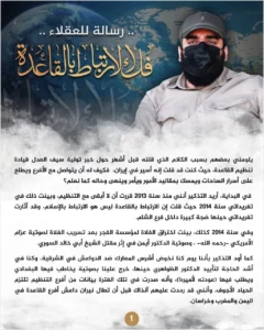 "Kepemimpinan Sayf al Adel yang saat ini berada di Iran sebenarnya berada di garis depan musuh umat saat ini. Jadi bagaimana bisa dia menghubungi cabang, meninjau rahasia lapangan, menggunakan kekuasaan, dan mengeluarkan perintah dan larangan, bila keadaanya seperti yang kita ketahui (ket: ditawan)," tambahnya.