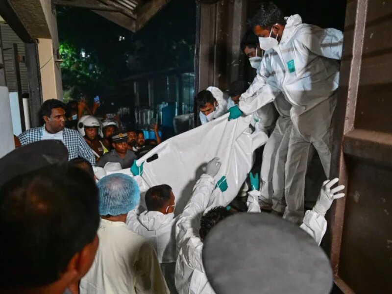 Tim medis Sri Lanka mengevakuasi jenazah para pelaut Iran yang tewas dalam serangan torpedo Amerika terhadap kapal “Dena”, 4 Maret 2026 (AFP).
