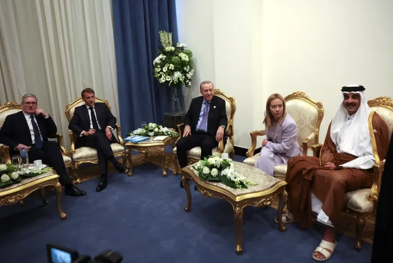Emir Negara Qatar, Sheikh Tamim bin Hamad Al Thani (kanan), bersama Presiden Turki (tengah), disusul Presiden Prancis dan Perdana Menteri Inggris (kiri), serta Perdana Menteri Italia (Reuters).