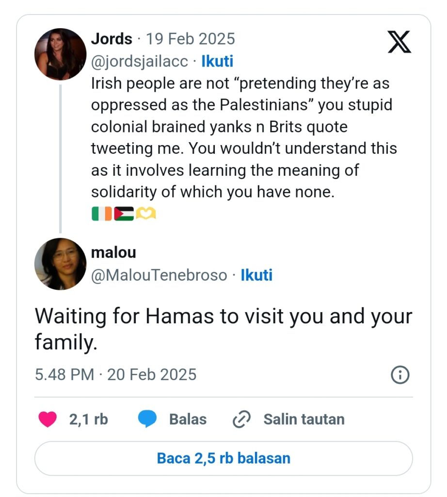 Sebagai tanggapan, seorang pengguna Zionis bernama Malou membalas:
